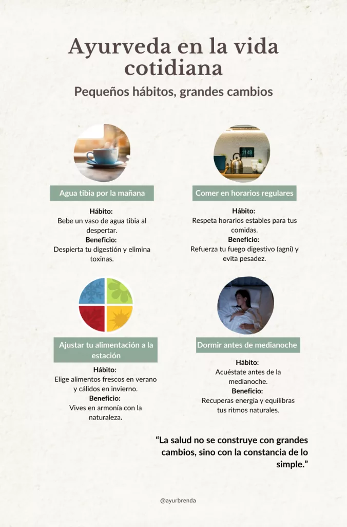 ✨ Ayurveda te recuerda que la salud no viene de lo extraordinario, sino de lo cotidiano. Son esas decisiones simples —cuando eliges un té en vez de un café extra, cuando respiras antes de comer, cuando apagas la luz para dormir— las que restauran tu equilibrio.