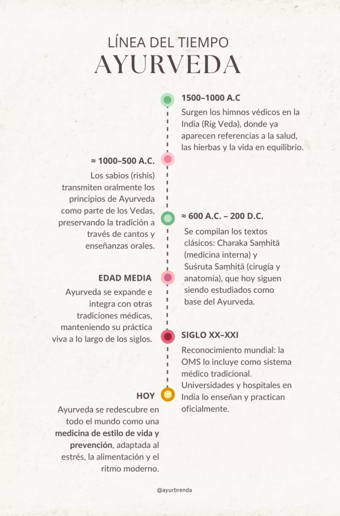 Cuando escuchamos que Ayurveda tiene miles de años de antigüedad, algunas personas creen que eso lo vuelve “viejo” o “fuera de época”. La realidad es que un conocimiento que ha perdurado tanto tiempo lo hace porque sigue siendo útil y relevante. Ayurveda nació en la India como parte de la tradición védica, junto con el yoga, la meditación y otras ciencias de la vida. Durante siglos se transmitió de manera oral, hasta quedar registrado en textos clásicos como el Charaka Saṃhitā y el Suśruta Saṃhitā, escritos entre el 600 a.C. y el 200 d.C., que hoy siguen siendo estudiados como auténticos manuales de salud.