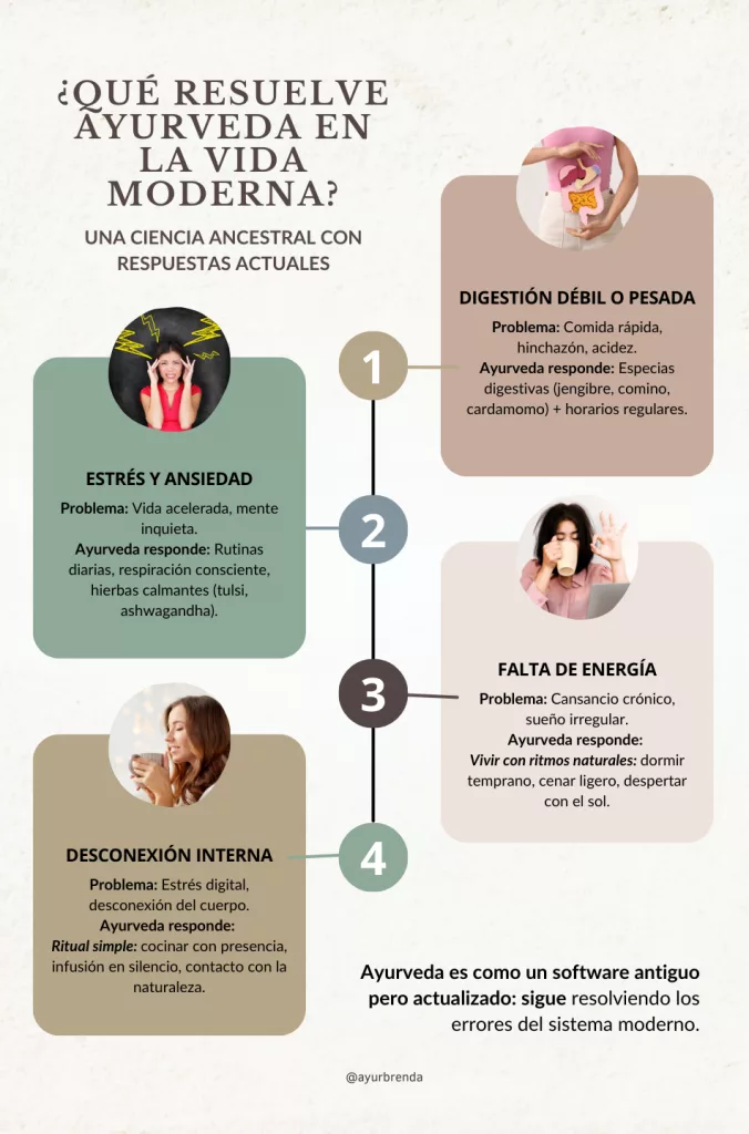 Puede parecer sorprendente que una ciencia con raíces de miles de años siga teniendo tanto que decirnos hoy. Pero si observamos con calma, los problemas de la vida moderna no son tan distintos de los que enfrentaban los seres humanos en el pasado: estrés, digestión débil, falta de energía y desconexión con uno mismo. La diferencia es que ahora los vivimos amplificados por la velocidad, las pantallas y la sobrecarga de estímulos.