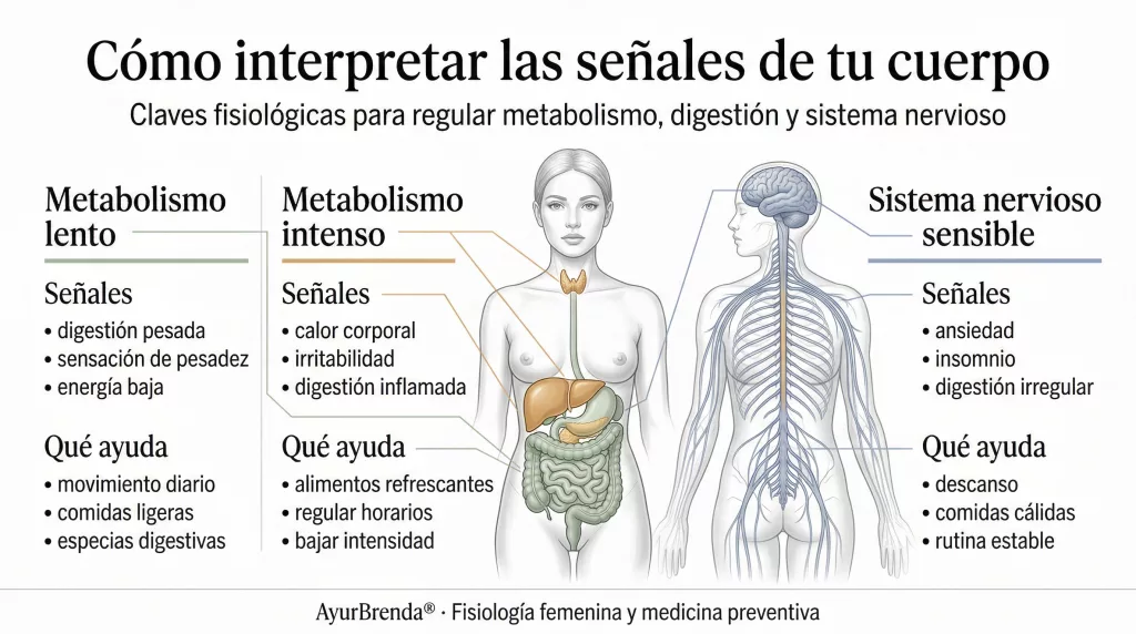 Una mujer en etapa Vata que duerme bien, come con ritmo, regula el estrés y nutre sus tejidos no tiene el mismo organismo que una mujer en etapa Vata con insomnio crónico, alimentación irregular y sistema nervioso permanentemente activado. El dosha dominante es el mismo; el estado del organismo, no.