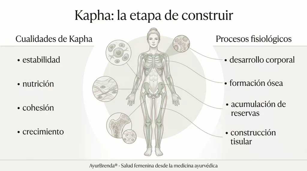 La infancia y la pubertad son, en términos ayurvédicos, tiempo Kapha. Las cualidades que dominan son humedad, peso, estructura, cohesión y crecimiento. El organismo está en modo anabólico: construye tejidos, densifica huesos, acumula reservas.