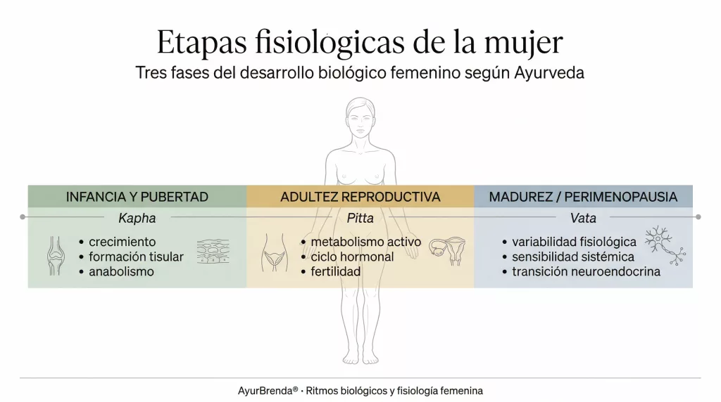 La tradición ayurvédica describe tres grandes fases del ciclo vital humano, cada una asociada a un dosha dominante. En la mujer, estas fases tienen expresiones fisiológicas específicas que dialogan directamente con lo que la endocrinología moderna describe.