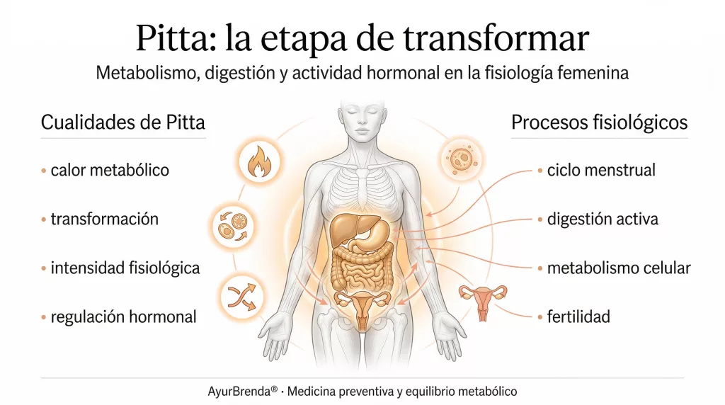 La adultez reproductiva — aproximadamente desde la menarquia hasta los primeros cambios perimenopausícos — es tiempo Pitta. Las cualidades dominantes son calor, intensidad, precisión, metabolismo activo y capacidad de transformación.