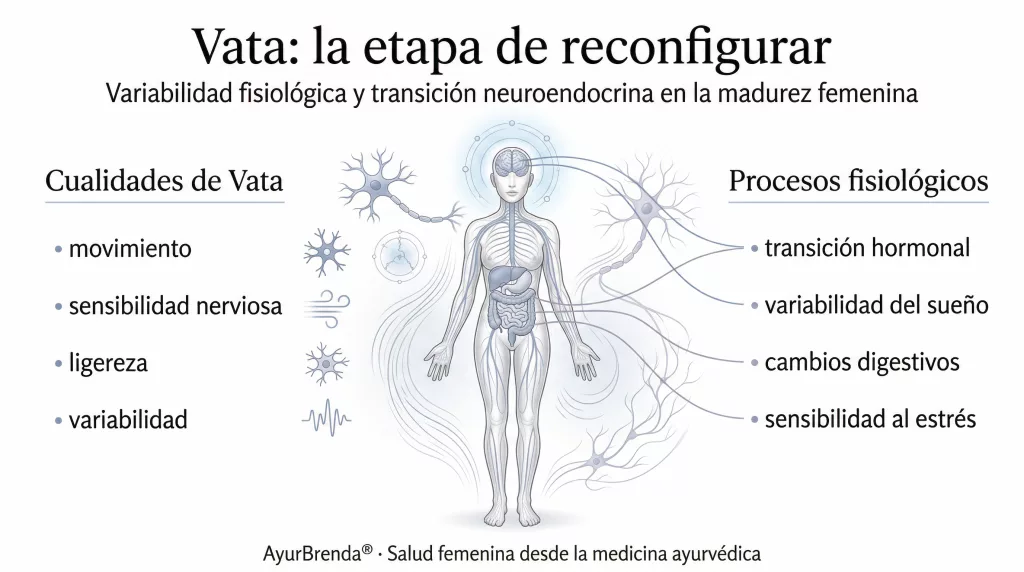 A partir de los 35–40 — y con mayor claridad en la perimenopausia —, las cualidades Vata comienzan a amplificarse en el organismo femenino. Esto no significa que la mujer “se vuelva Vata”: significa que el contexto fisiológico cambia de manera que ciertas cualidades Vata — variabilidad, sequedad, sensibilidad nerviosa, ligereza — tienen más peso relativo.